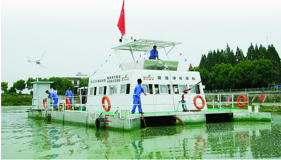8月18日,治理蓝藻的“凝藻净化平台”在巢湖西半湖下水试验。为防止巢湖蓝藻暴发,合肥市环保部门联合环保企业开发的“凝藻净化平台”,能够在柔性围控水域沿水面动态收集分离蓝藻,实现对突发蓝藻应急隔离和高效清除。目前,这项技术已经进入技术性能测试与验证阶段,应用后将能够在大面积水体中收集分离蓝藻。(记者吴文兵摄影报道)